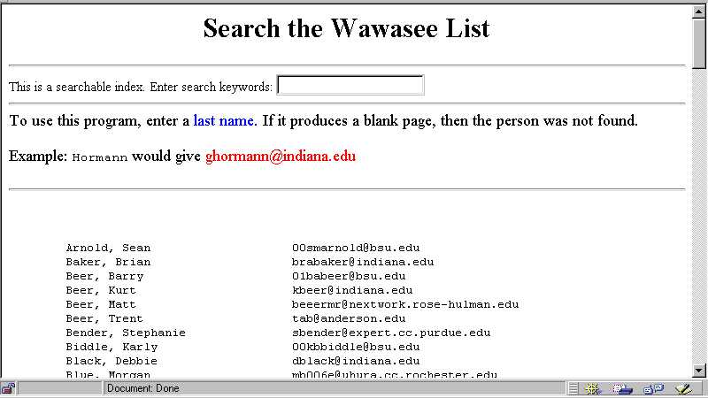 The Wawasee List was conceived in late 1994 by Greg Hormann (class of 1994). The original version contained the names and email address of 15 people who had graduated with Greg from Wawasee. These names were constructed by searching the online databases of universities which were available in finger and/or gopher formats. (Anybody else know what gopher is/was?) The original list was stored both as a text file on an HP9000 (big old Unix machine) and as a pine (e-mail tool for Unix machines) mailing list. The list was distributed by email on a regular basis as well as by request. (Members Listed: 15. Lines of Code: 0)