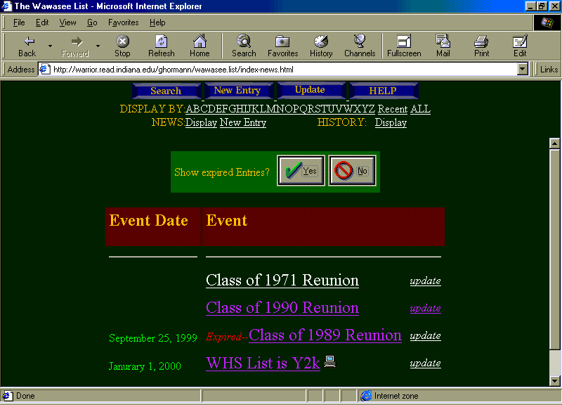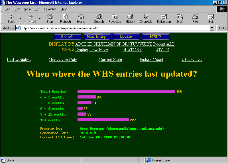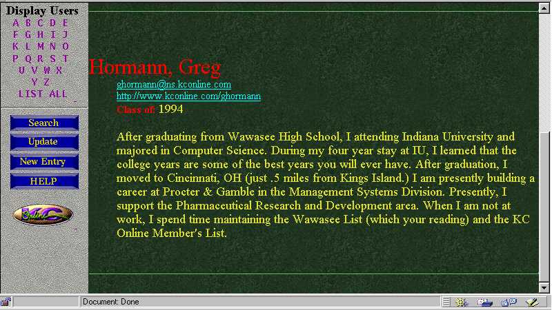 Before the beginning of 1997, the Wawasee List had out grown the old text file and email distribution system created in 1994. (Pine wasn't handling sending the same email message to 100+ people very well.) To combat this problem, the Wawasee List went through its most bold and challenging change ever: moving to an entire WWW distribution system. To accomplish this goal, a new database storage system for the List was build as were multiple CGI programs for retrieving, updated, and adding data. This new system also added many new fields: Graduation Date, Maiden Name, Home Page URL, and the "What I am up to" text area. (Members Listed: 119. Lines of Code: 1110) |