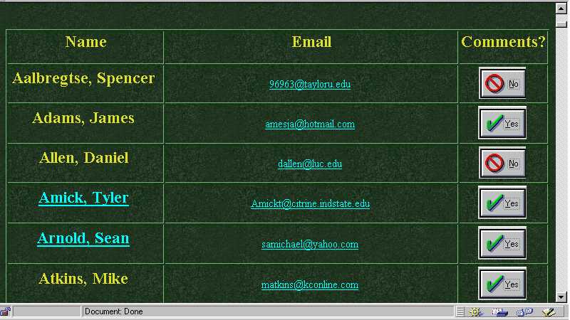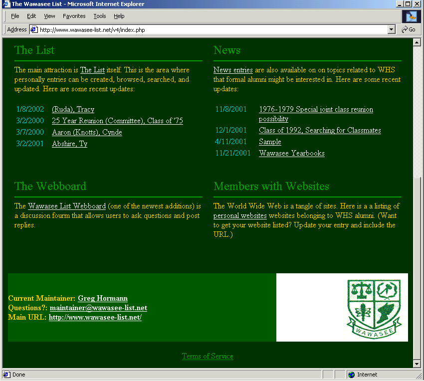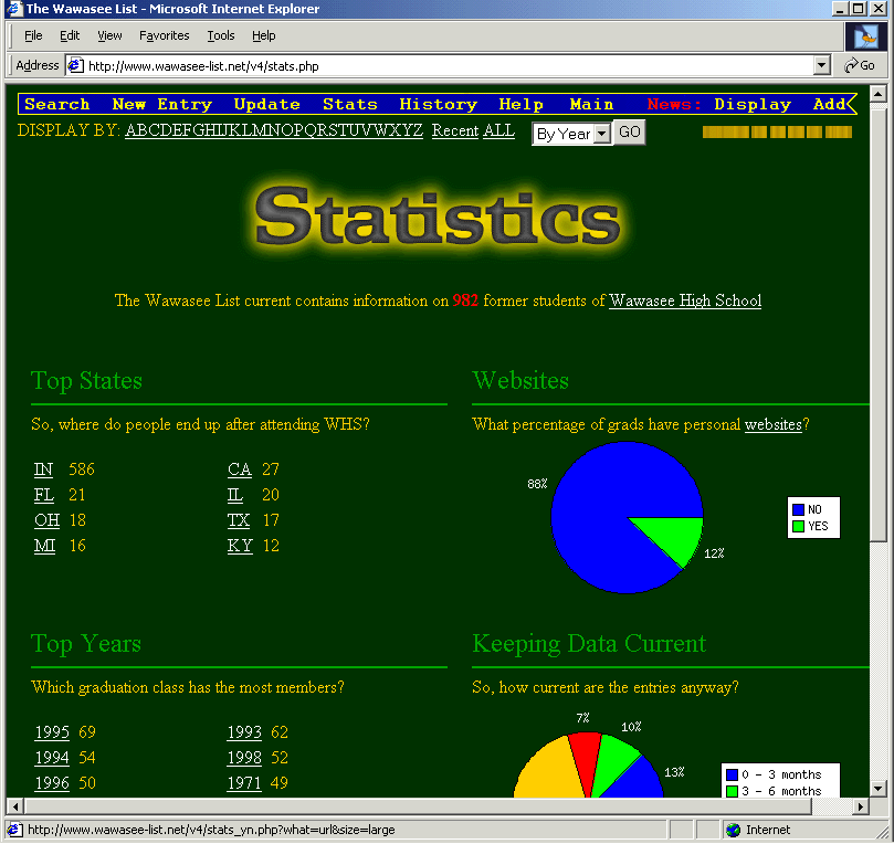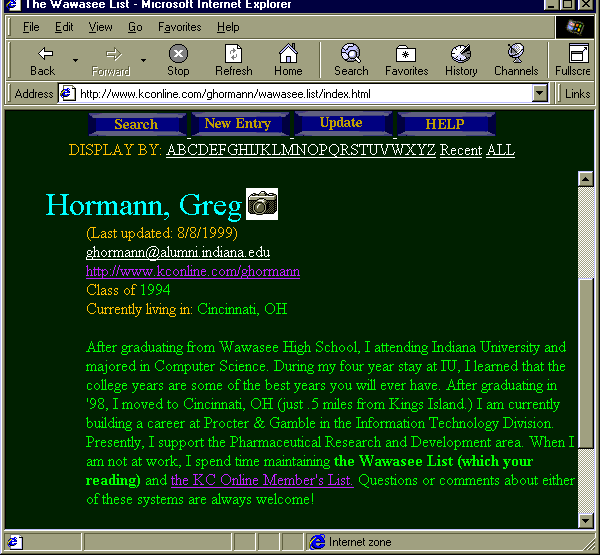 In Late February 1999, the next version of the Wawasee List (dubbed version 3) was unveiled. This new version added the following fields: current city, current state, picture link, and last updated field. This version also included many enhancements (e.g. huge user interface work over, new search functionality, and a brand new internal database schema which make the system much easier to maintain). (As a result of the DB changes, database changes started occurring within 24 hours!) (Members Listed: 319, Lines of Code: 1148) |