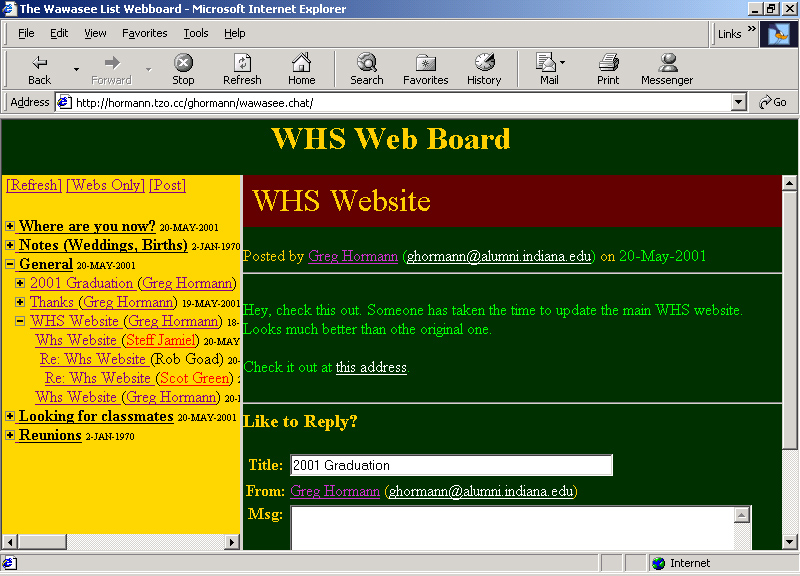 January 4, 2000, Version 3.5 of the Wawasee List was released. This release added the long awaited Announcement Board (better known as WHS News) functionality to the Wawasee list. This new functionality allowed users to post announcements for events former WHS students might find interesting. (Members Listed: 419 Lines of Code: 2302) |